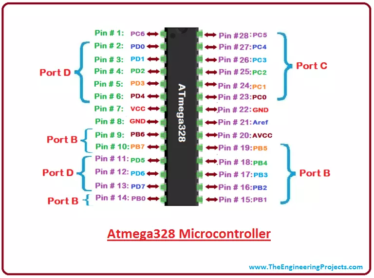 Le microcontrôleur Atmega328 est placé sur la carte et offre un certain nombre de fonctionnalités telles que des minuteries, des compteurs, des interruptions, PWM, CPU, broches d’E/S et est basé sur une horloge de 16 MHz qui permet de produire plus de fréquences et un plus grand nombre d’instructions par cycle.