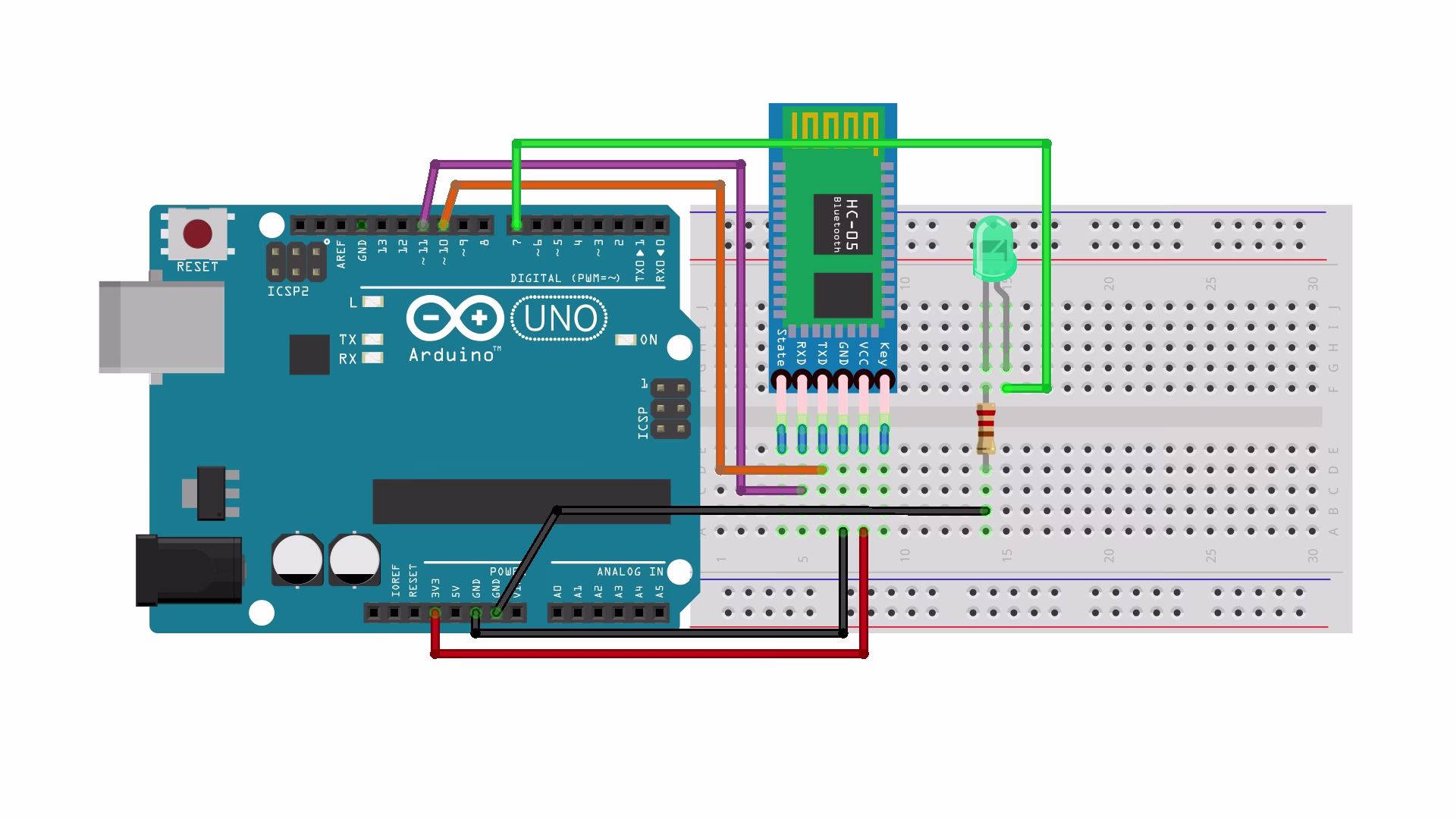 - Branchez la broche LED si vous avez besoin d’utiliser le mode « commande » du module. Vous pouvez reconfigurer la parité, la vitesse, et autre liée au Bluetooth. Vous pouvez ainsi connecter n’importe quelle sortie numérique de l’Arduino